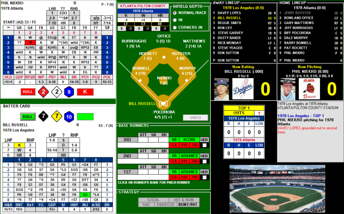 Expanding the batter’s grid enabled me to include results like hitting with runners in scoring position (RISP) compared to non-RISP situations, hitting behind runners in hit and run situations and infield singles. A larger grid also expands the diversity of the individual results, allowing the card to better replicate a player’s actual hit location and hit type. Batters now have individualized H&R and SH ranges for the strategy rolls on their card, making it easier to implement.